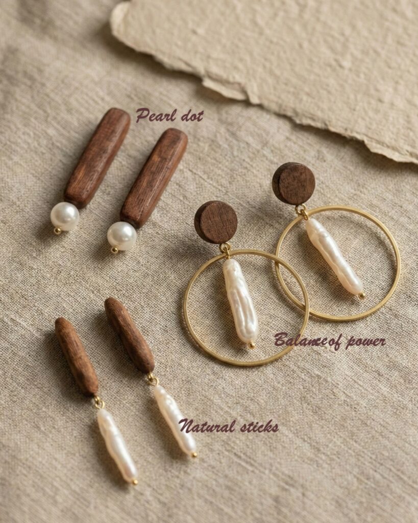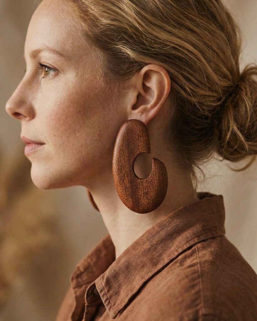 Kolczyki, pierścionki czy naszyjniki z drewna łączą lekkość z trwałością. Nie dominują stylizacji — raczej ją dopełniają.